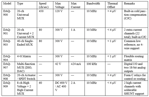 Sistem DAQ-9600 podpira sedem modularnih kartic, ki jih je mogoče vgraditi v glavno enoto. Vsak modul ponuja specifične zmožnosti za sprejemanje širokega spektra signalov in merilnih potreb. Naslednja tabela poudarja ključne električne lastnosti in funkcionalnosti vsakega modula, zlasti tiste, povezane z merjenjem toka: