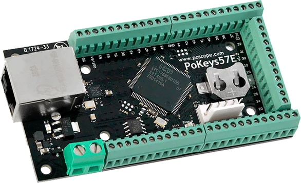 - Pokeys57 omogoča 55 digitalnih I/O (5V tolerant), 7 analognih vhodov (12-bit)
