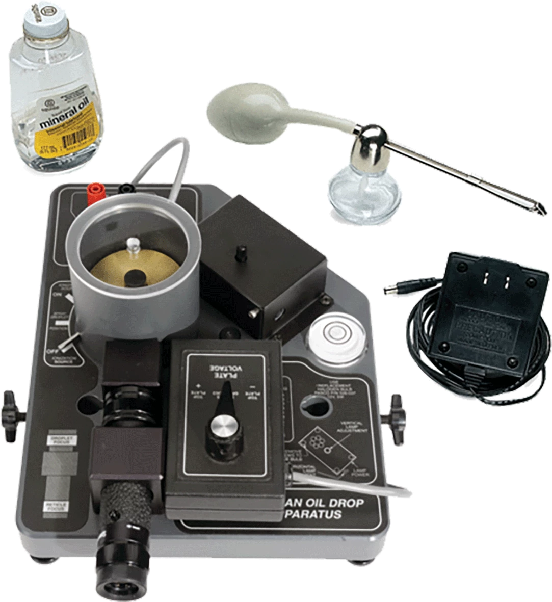 - Jasno opazovanje kapljic in nizko odklonsko gibanje kapljic sta bistvenega pomena za uspeh pri Millikanovem klasičnem eksperimentu. Oprema podjetja PASCO uporablja predhodno poravnan optični sistem in posebno kondenzator za doseganje teh pogojev.