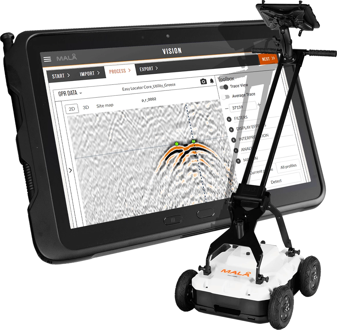 MALÅ Easy Locator Core je vrhunski, visokokakovostni, inteligentni radar za prodiranje v tla, namenjen strokovnjakom za lociranje pripomočkov. MALÅ Easy Locator Core vključuje podporo za realnočasovno interpretacijo preko MALÅ AI; brezžično zbiranje podatkov z uporabo mobilnih naprav; shranjevanje v oblaku, postprocesiranje in poročanje na kraju samem z uporabo MALÅ Vision.