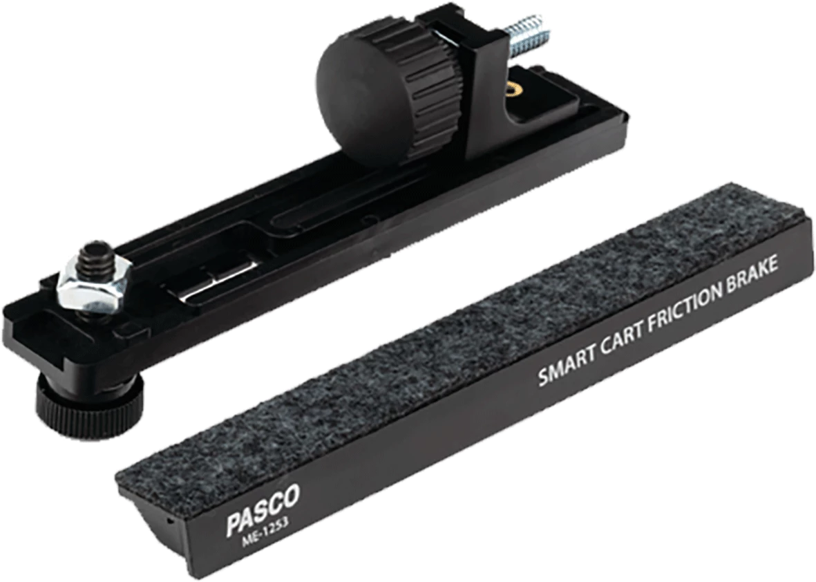 ME-1253 Smart Cart zavorni sistem na osnovi trenja je zasnovan za ustavljanje premikajočega se vozička Smart Cart na kateremkoli položaju, ki ga izbere uporabnik, na dinamični stezi. Uporablja trenje med filcem na vozičku in zaobljenim vijakom na nosilcu steze za zmanjšanje hitrosti vozička. Dvojni dizajn sestoji iz zavornega obloga (nameščenega na dodatni pladenj Smart Cart) in nosilca steze (pritrditev na katerokoli PASCO dinamično stezo). Sila zaviranja se enostavno prilagodi z obračanjem gumba na nosilcu za stezo. Idealno za nastavitve ukrivljenega PAStrack, poskuse na naklonjeni ravnini ali katerikoli laboratorijski poskus, ki zahteva določen ustavni položaj.