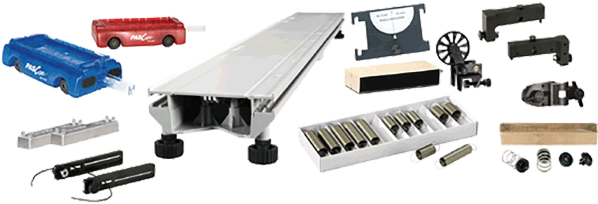- Ta konfiguracija vključuje dva plastična vozička PAScar, 2,2-metrsko dinamično stezo iz aluminija in komplet dodatkov.