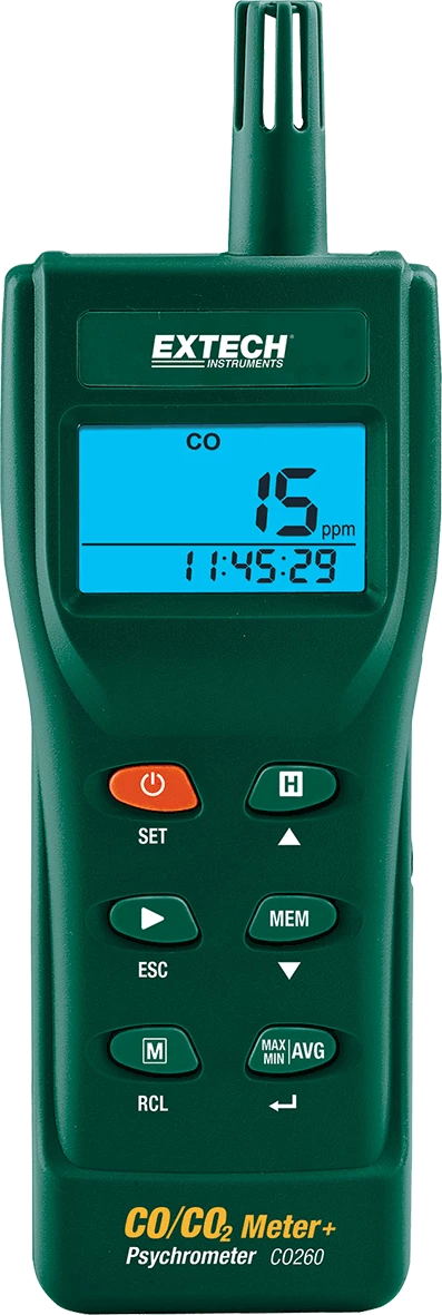 - Meritvena področja: CO2 od 0 do 9999 ppm, CO od 0 do 1000 ppm, temperatura: -20 do 60 °C, vlažnost zraka od 0,1 do 99% RH, rosišče - 20 do 60 °C, mokra žarnica -5 do 60 °C