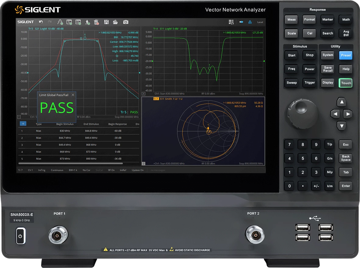 - Analizatorji vektorskih omrežij serije SIGLENT SNA5000X-E imajo frekvenčno območje od 9 kHz do 6,5 GHz, ki podpirajo merjenje parametrov razpršitve z dvema portoma, diferencialnega parametra in parametrov časovnega domena.