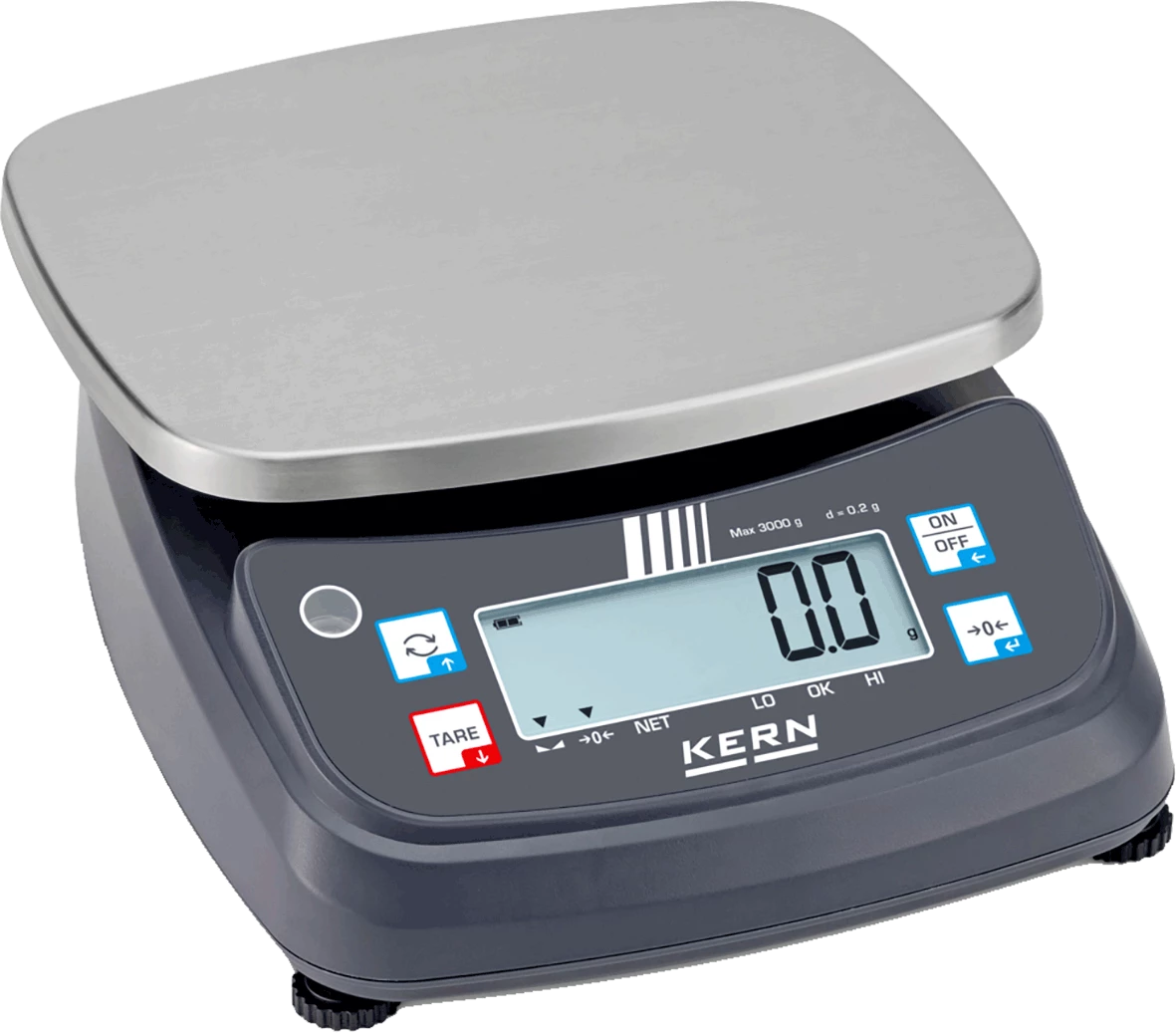 - Osnovna namizna tehtnica s tehtalno ploščo iz nerjavečega jekla in funkcijo kontrolnega tehtanja